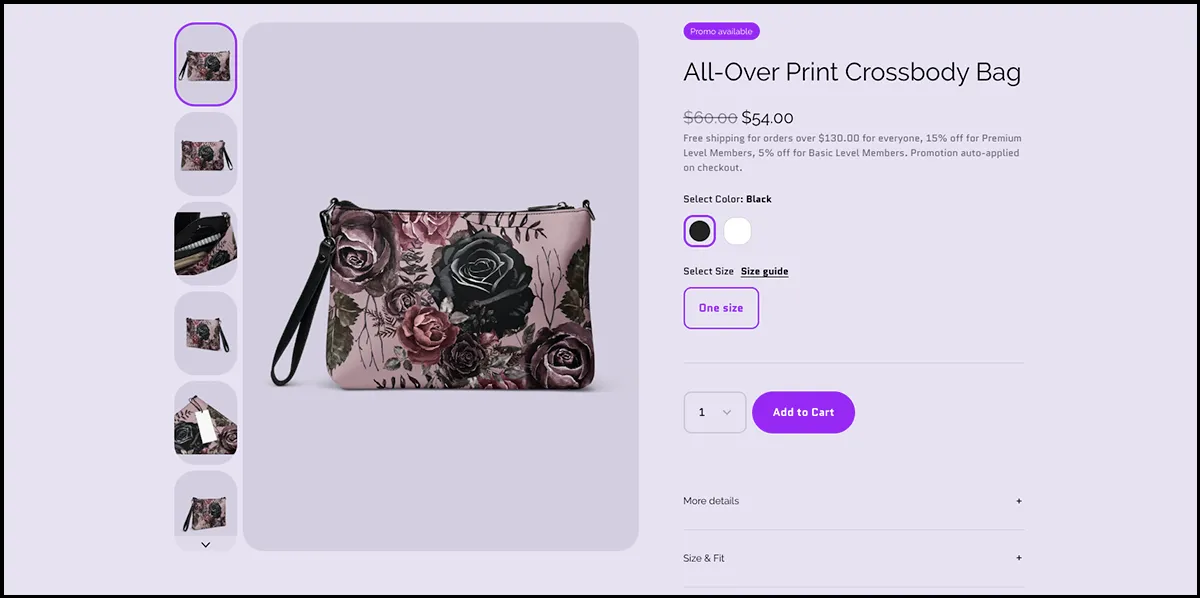 Customization & Selling: Fourthwall’s All-Over Print Utility Crossbody Bag offers ample space for customization. You can add vibrant designs, patterns, or even logos, creating a product that resonates with your target market.