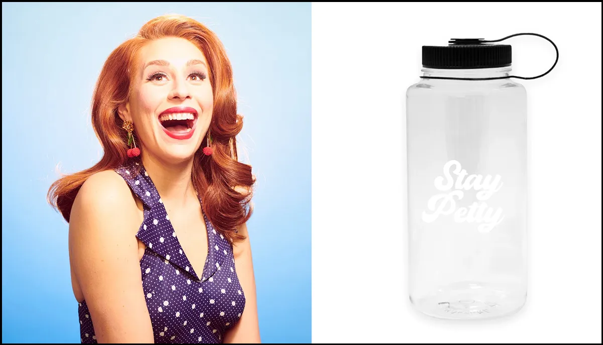 Charlotte Dobre, known for her witty and entertaining content, offers the Stay Petty Nalgene Bottle in her online shop.