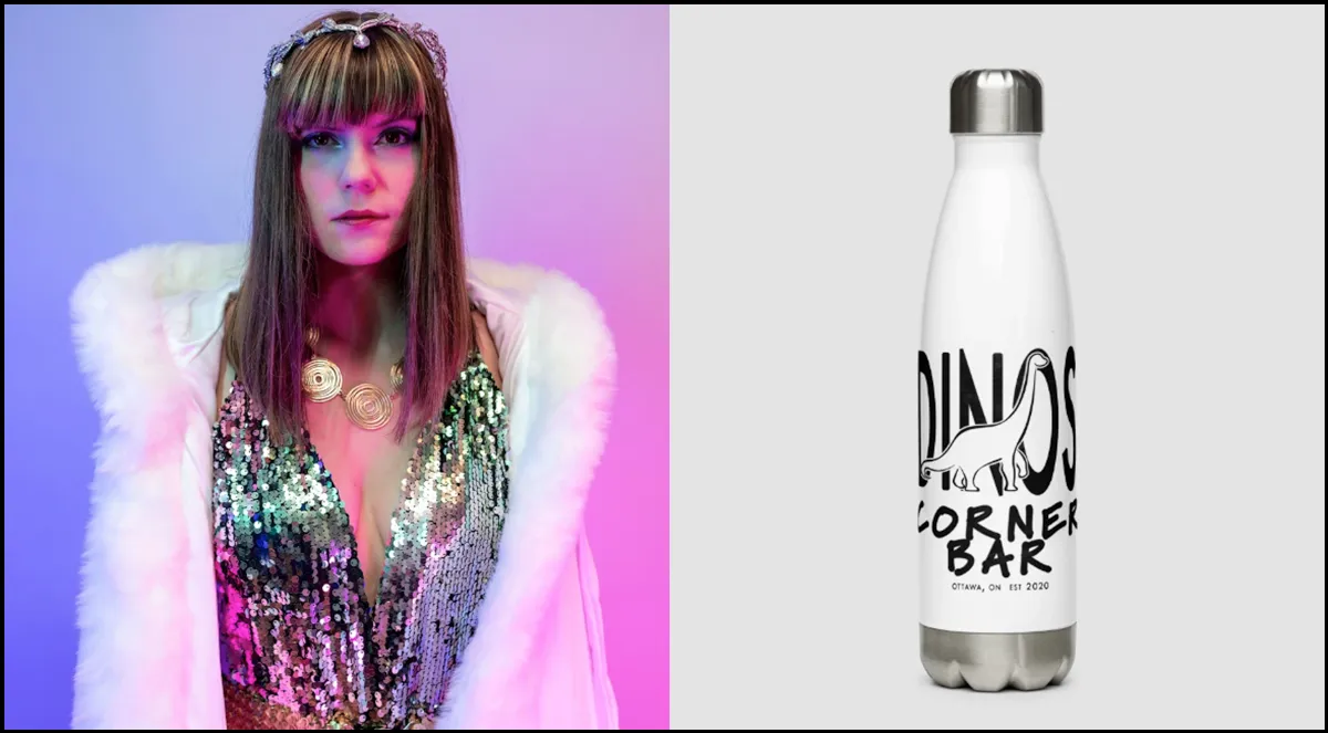 Musician and Twitch streamer Danielle Allard offers the Dinos Corner Bar Water Bottle, featuring a simplistic, eye-catching design based on her Dino logo.