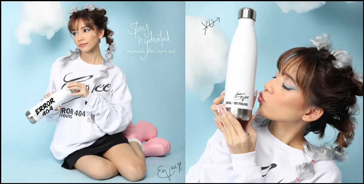 Eevee Enara, a creative Twitch streamer, showcases her Error 404 Waterbottle in her shop. The bottle blends digital culture with stylish functionality.