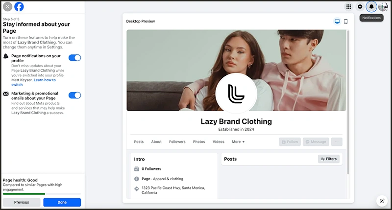 To stay informed and responsive, click to activate both and "Page Notifications" and "Marketing Emails" before setting up your page. This ensures you’ll receive updates about your page activity, such as new comments, messages, or likes, directly to your email or within the Facebook app.