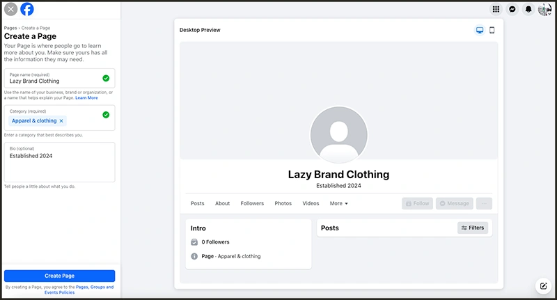 Enter your business name as the title of your Facebook page. Be specific if your business has multiple branches (e.g., "Green Garden Café - Downtown"). Select a relevant business category that reflects your brand, such as "Local Business," "Retail," or "Public Figure." This ensures your page has the right features to meet your needs. Once you've filled everything out, click "Create Page" at the bottom left-hand corner.