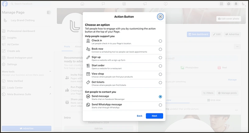 Now that your page is all set up, its time to customize your tab menu. Tailor the layout to showcase your offerings and make navigation easy for visitors. Use the action button feature to guide visitors toward taking meaningful steps, such as “Sign Up,” “Book Now,” or “View Shop.” The button can link to your website, online store, or reservation system, creating a seamless user experience.
