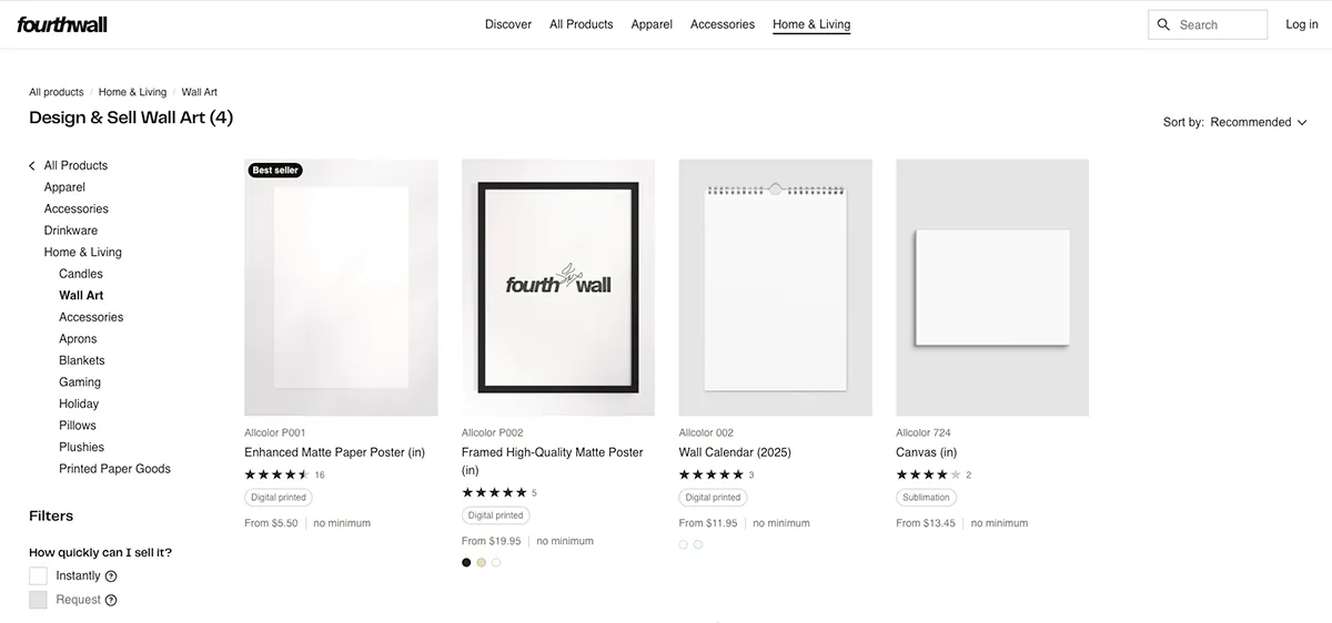 Fourthwall is a fantastic choice for artists looking to sell wall art with minimal production effort. The platform offers a variety of custom wall art products, including canvas prints, posters, and wall calendars, which you can personalize with your designs.
