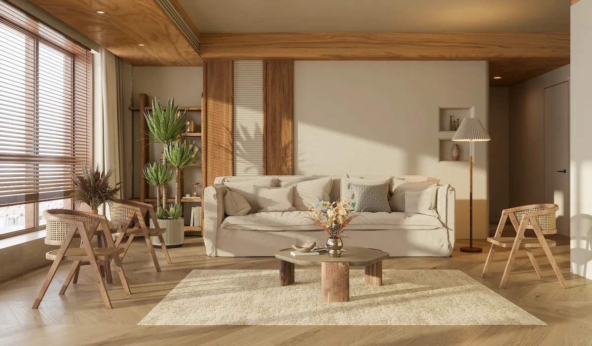 This hybrid trend seamlessly blends Scandinavian simplicity with Japanese elegance, characterized by clean lines, warm wood tones, and intentional minimalism.