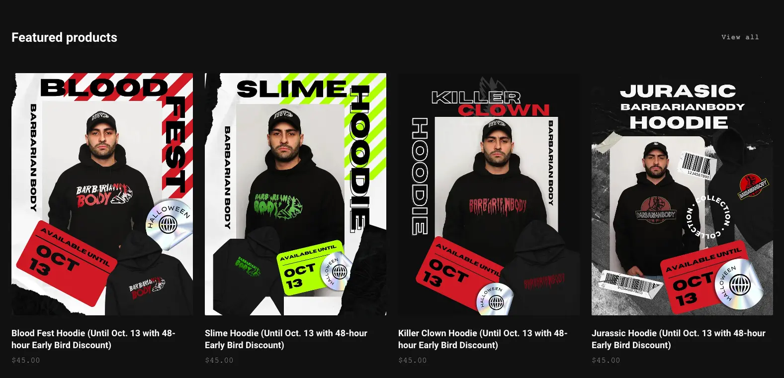 For instance, The Barbarian Body sells limited-edition seasonal hoodies tailored for Halloween enthusiasts. The hoodies featuring sharp and vibrant designs that not only match the creators fitness persona but allow him to capitalize on the excitement surrounding the holiday.