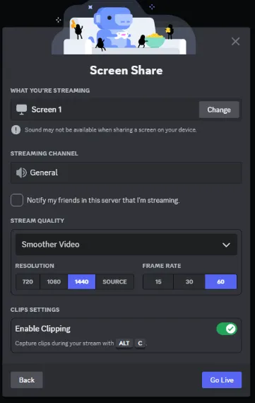 Want to showcase something different? Click the "Settings" icon next to your video feed and seamlessly change screens during your Discord stream. Just click "Change Screens" or select a new window to share—it's that simple!