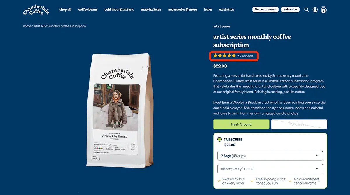 For example, Chamberlain Coffee showcases reviews and ratings for each of its products on its website, providing potential buyers with insights from fellow coffee enthusiasts.