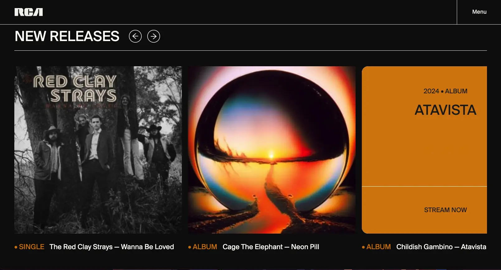 The consistent use of high-quality images and interactive elements throughout the site reinforces RCA's brand identity, making it a dynamic platform for music lovers and industry professionals.