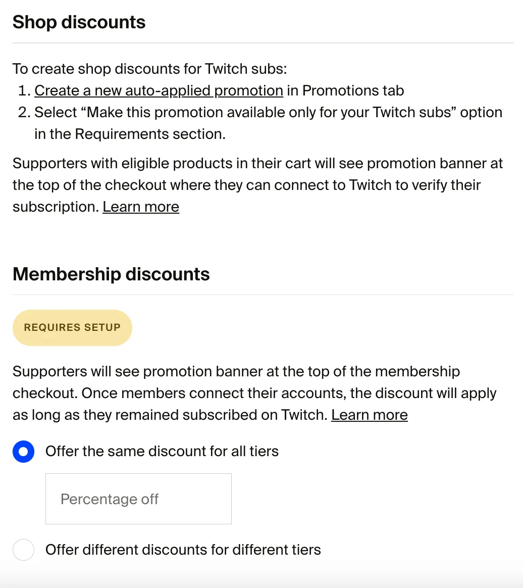 There’s now an additional way to show extra love to your followers that support you on Twitch. Creators can set up special promotions and discounts on products or memberships just for their Twitch subscribers. You can customize these offerings based on tier, and they’ll be automatically applied for supporters who log into their Twitch when placing their order.