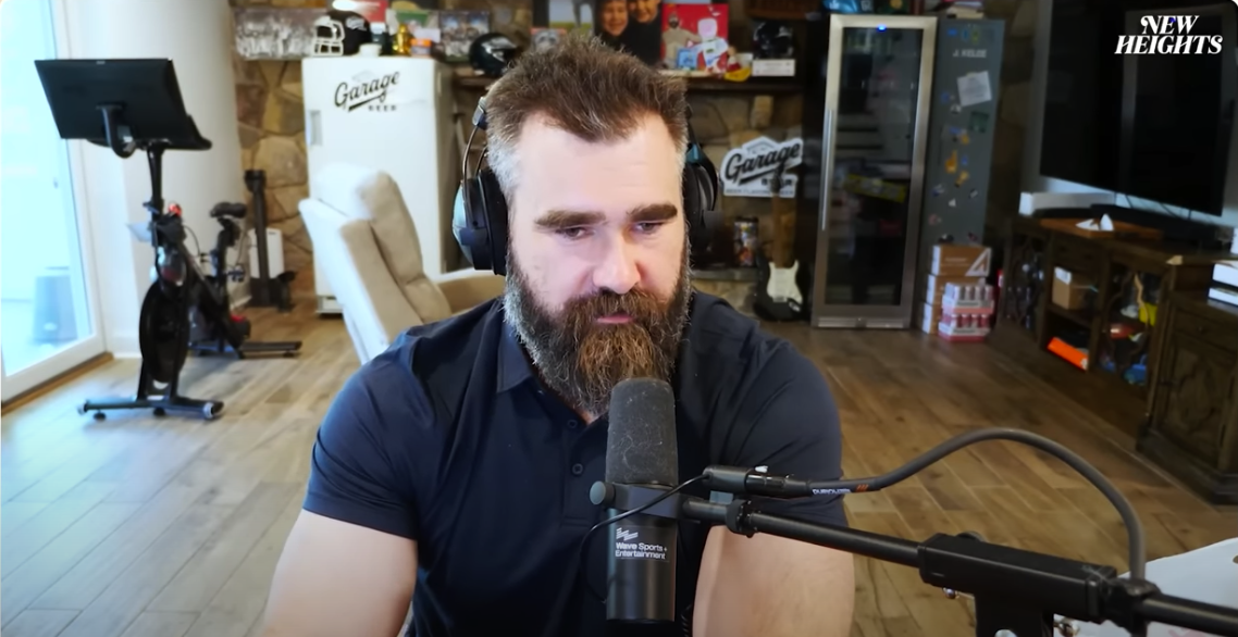 Let’s start with New Heights, the Kelce brothers’ top-ranked podcast available on YouTube, Spotify, and Apple. In nearly every episode, Garage Beer’s logo can be seen hanging in the background of Jason Kelce’s actual garage, turning the podcast set into a subtle billboard.