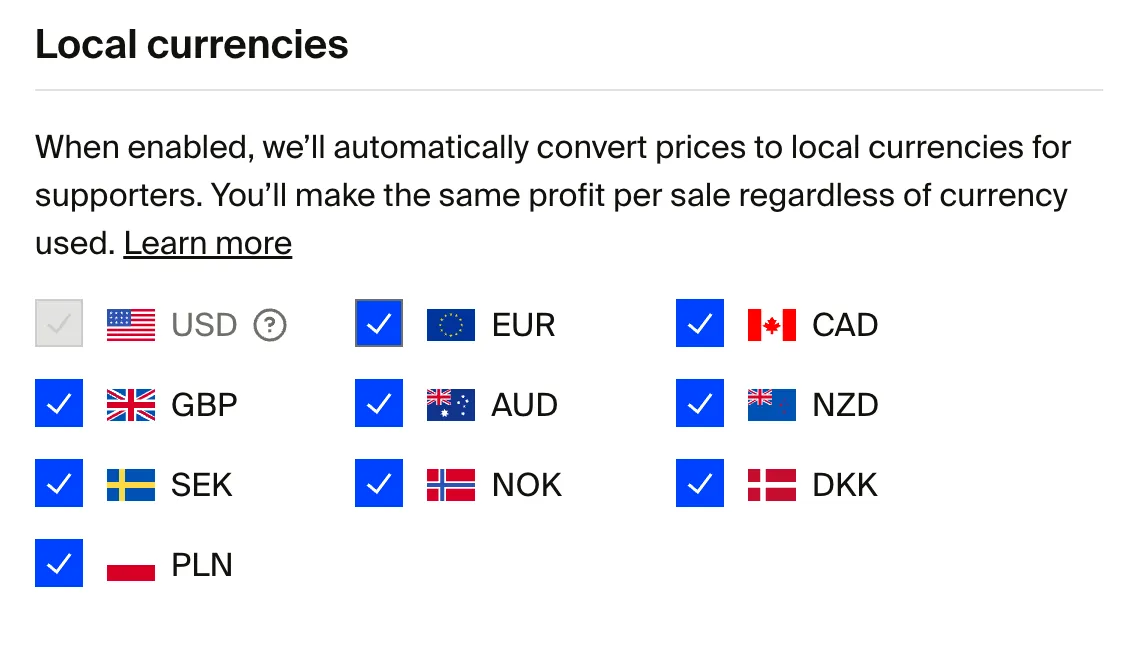 Allowing fans to buy in their local currency increases your conversion rate and improves the shopping experience for your international fans. You’ll make the same profit per order, regardless of what currency is used for purchase.