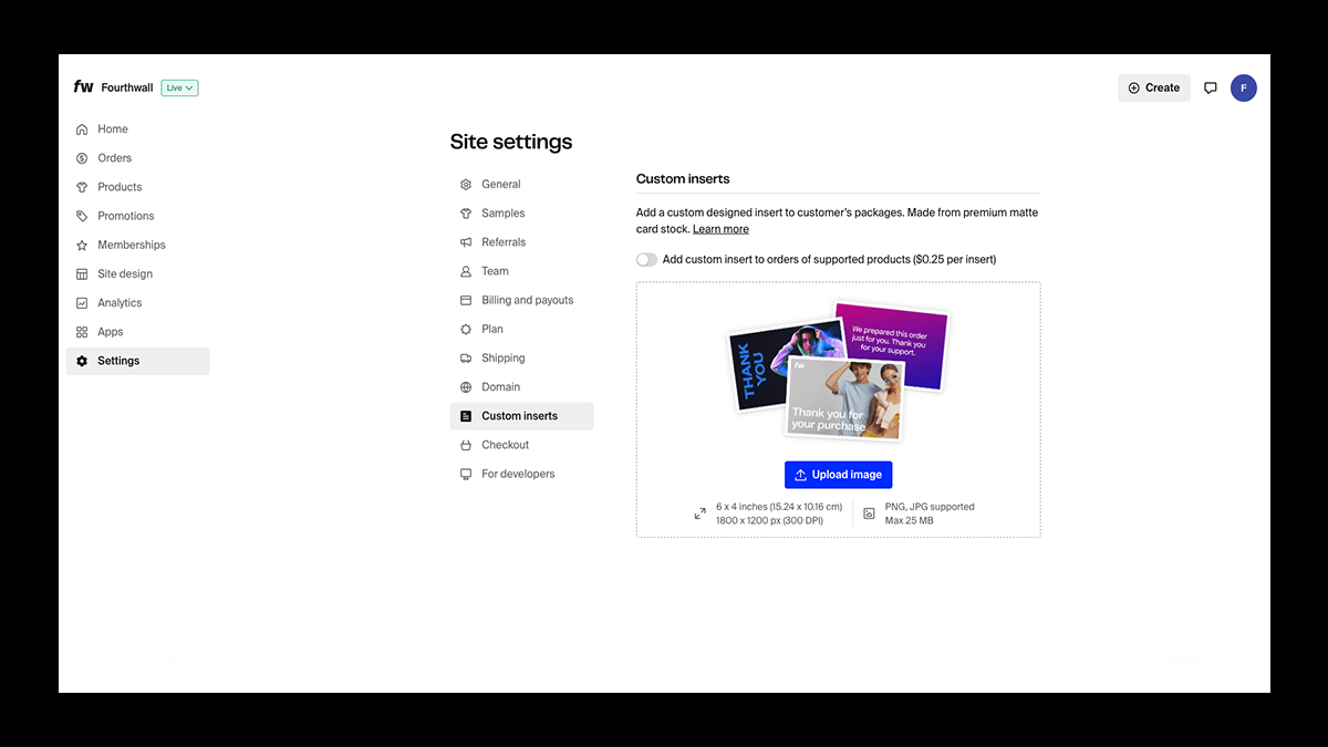 Go to your Fourthwall dashboard, navigate to Settings → Custom Inserts, upload your design, and toggle the feature on. Once activated, the insert will be added to every outgoing order.