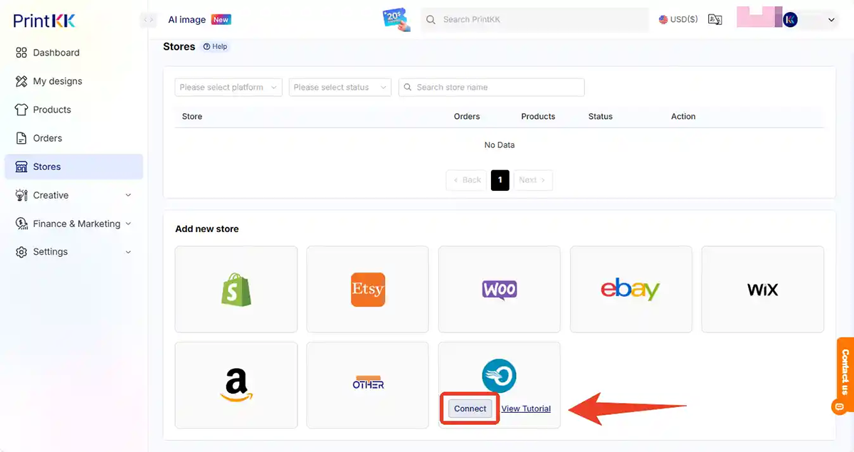 PrintKK integrates with major eCommerce platforms and marketplaces, including Shopify, Etsy, WooCommerce, Wix, eBay, and Walmart, so orders sync automatically from your store.