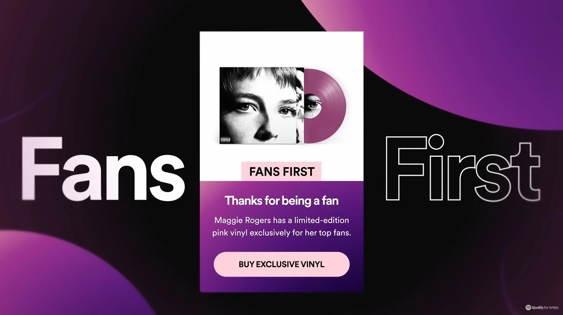 Once your Spotify streams start really ramping up, you can launch a Marquee or Showcase campaign, or see if you qualify for Discovery Mode. Fans First is another marketing program that can open up for you once you’ve got the numbers; it enables artists to send emails offering unique merch, experiences, new music previews, or ticket presales to their top listening fans on Spotify.