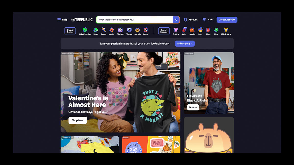 Where TeePublic really shines is distribution: it actively drives traffic through strong SEO, pop-culture discovery, and frequent site-wide sales that push designs in front of buyers without creators needing to promote a store themselves.