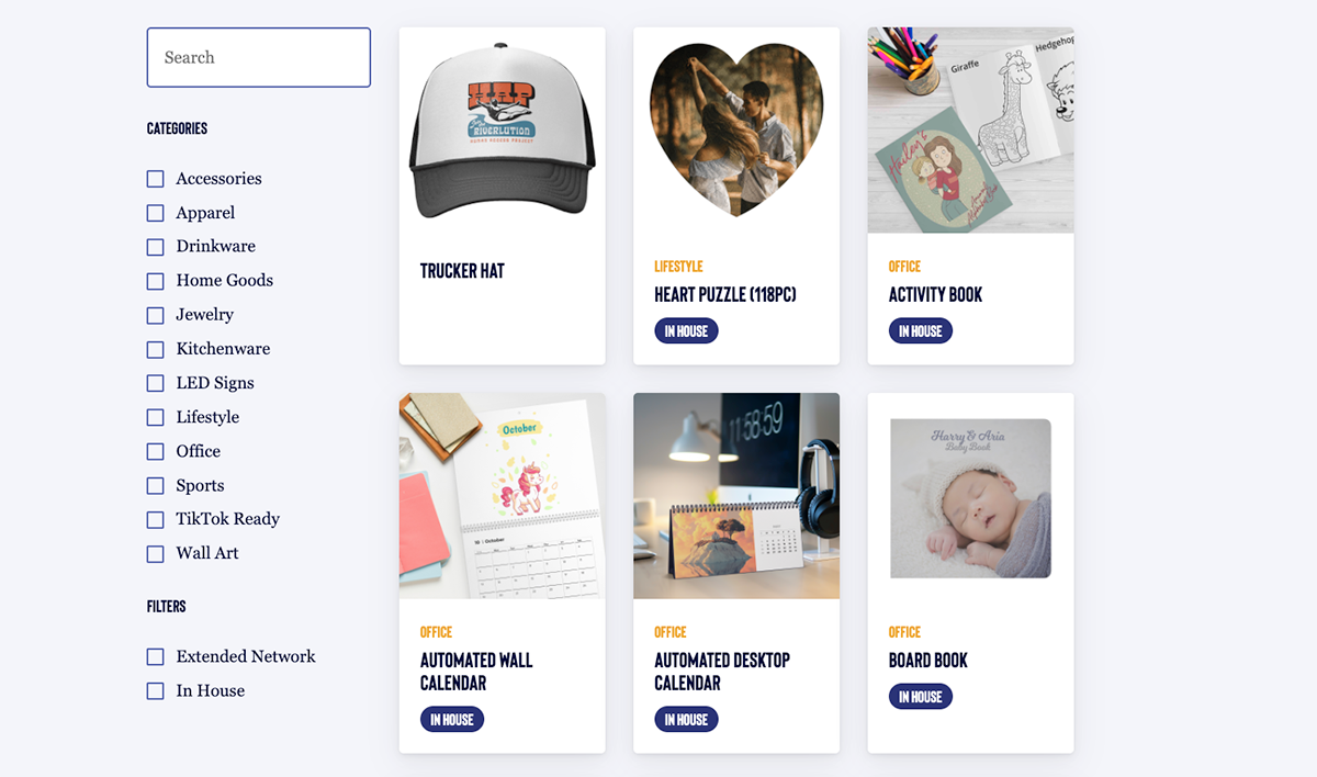 Its product lineup covers core categories like apparel, home décor, stationery, wall art, and specialty items such as puzzles, calendars, and pet products, all produced using methods like DTG, sublimation, digital printing, and embroidery.