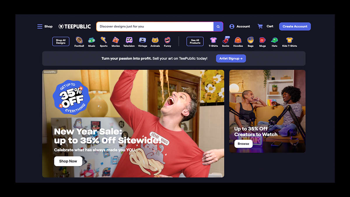 What really sets TeePublic apart is built-in demand: the platform drives organic traffic through SEO and frequent site-wide promotions, which helps designs sell without any marketing effort.