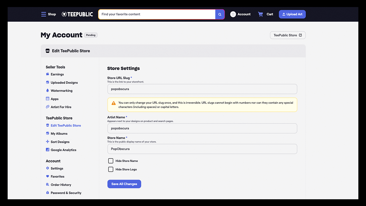 If you qualify for an Artisan account, you unlock the ability to launch a Dashery storefront directly from your TeePublic settings.