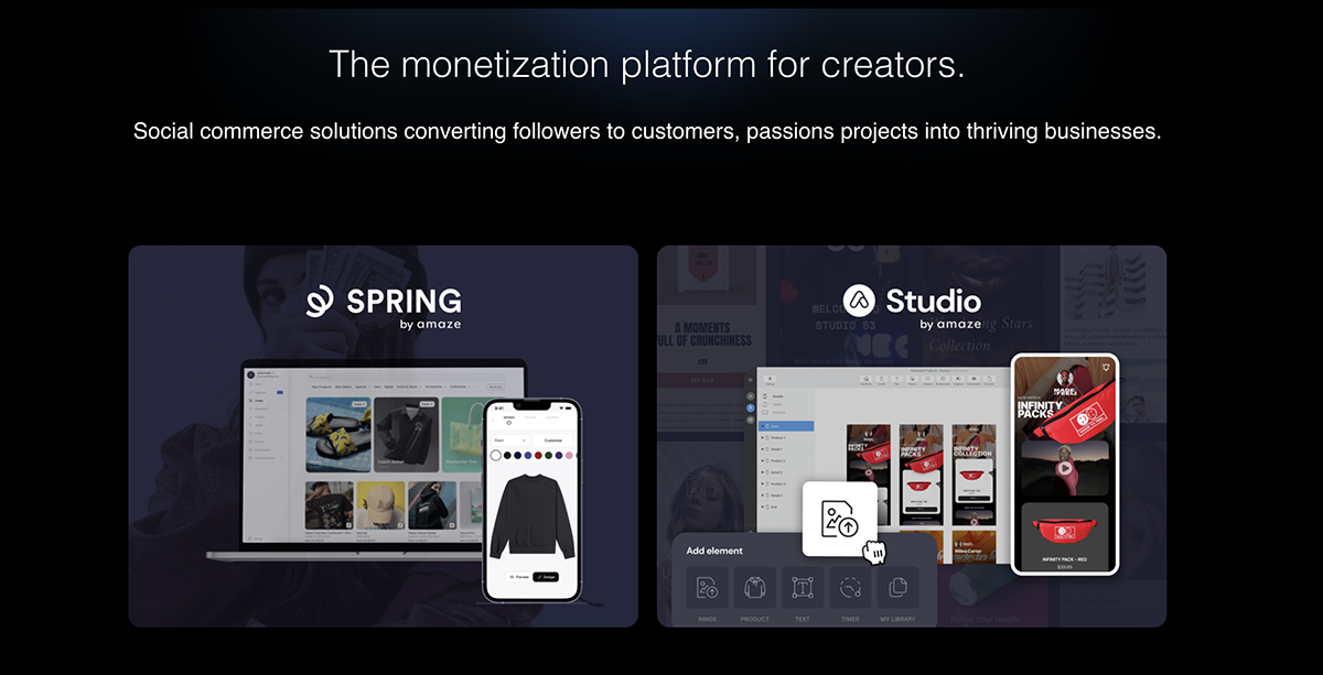 A key strength of Amaze lies in its partnerships and built-in integrations, including Spring (formerly Teespring)—a creator-powered marketplace where fans can shop curated merch that reflects their interests—and Studio, which provides creators with tools to design immersive shopping experiences.