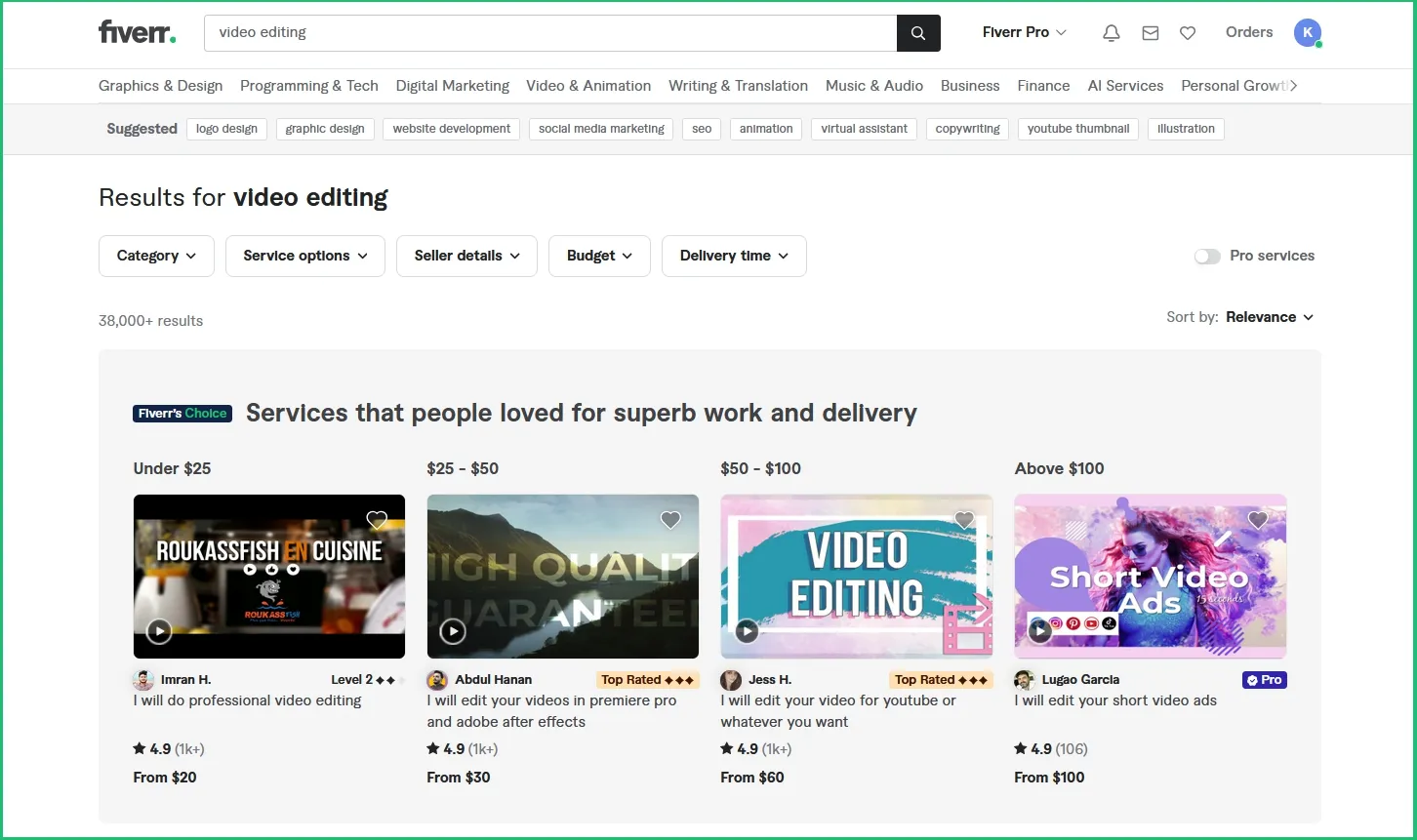 Pros and Cons: Pros include a wide range of prices and editor expertise, but basically anyone can list their skills on Fiverr, which means that quality can vary; so it’s crucial to review video editors’ portfolios and be clear about what you require for the editing of your video.
