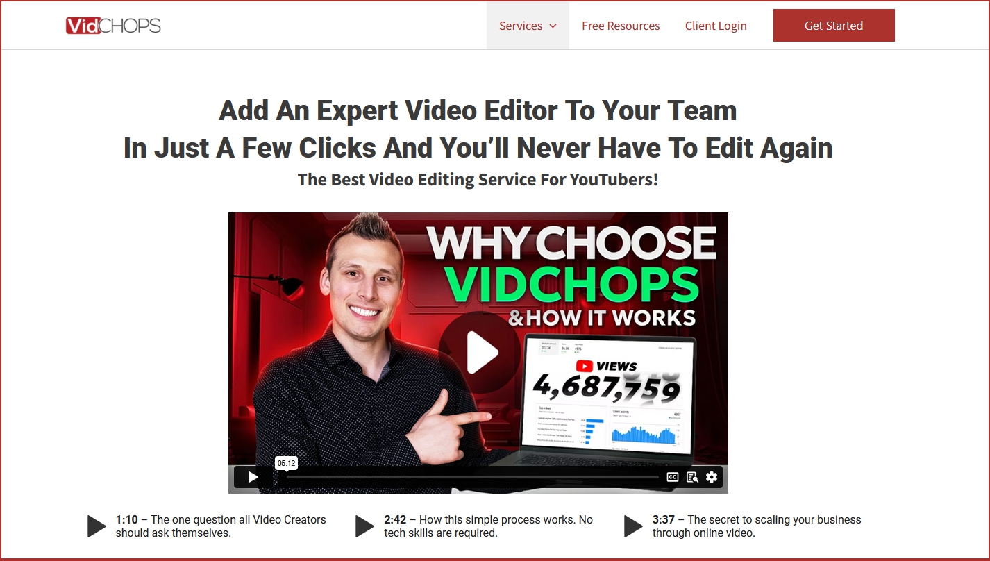 VidChops specializes in subscription-based editing services, which can be ideal for creators needing regular editing support for multiple videos each month. VidChops offers several revisions per video, your own dedicated video editor, access to their library of stock audio and video footage, and 1-2 days turnaround (via their monthly subscription model.)