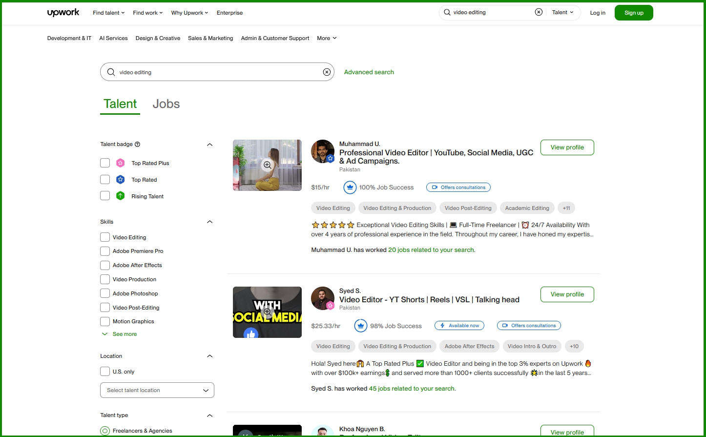 Pros and Cons: There’s a long list of video editors to choose from on Upwork, and that section of the site has a customer rating of 4.8 out of 5 based on over 40,000 client reviews, so there’s definitely talent for hire; but you’ll still need to vet freelancers carefully, as they all work independently.