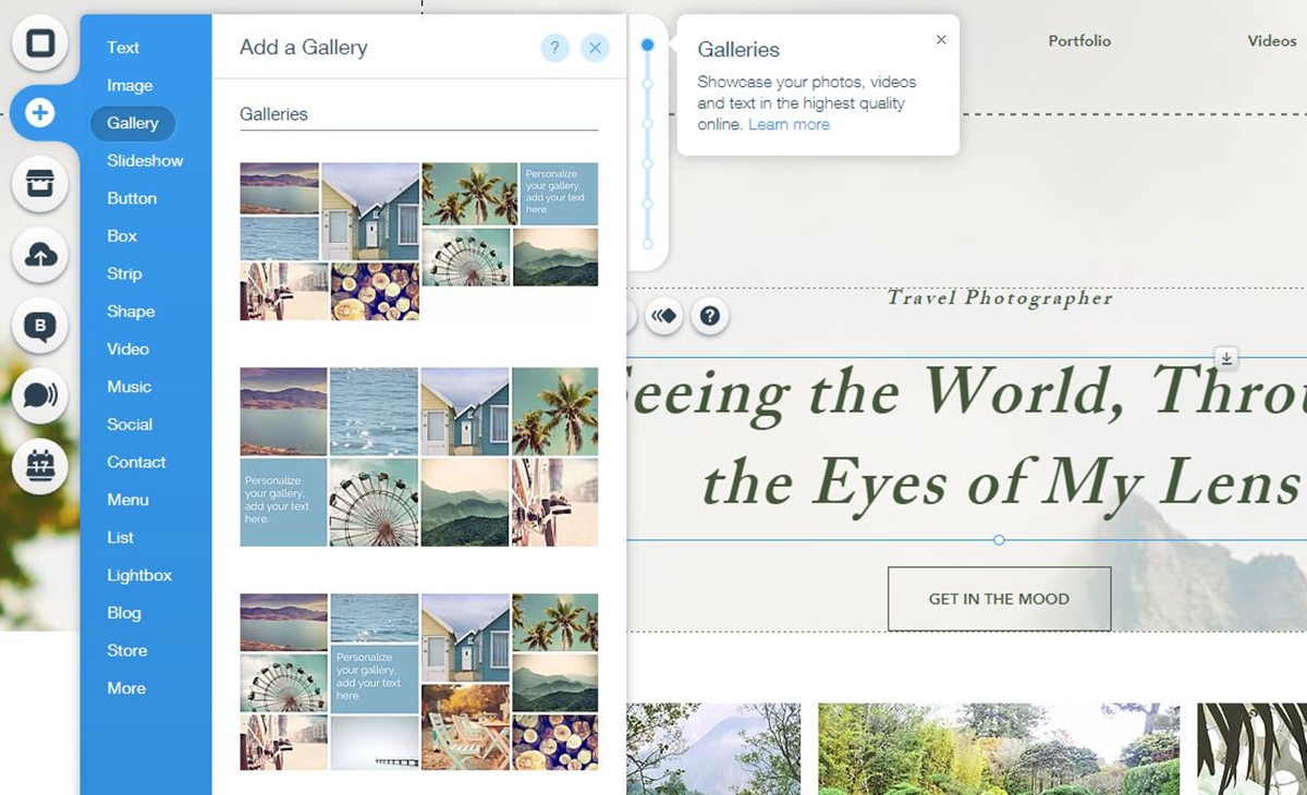 You can start from one of 900+ professionally designed templates, then click on any element to drag, resize, or edit text, images, videos, and galleries directly on the page.