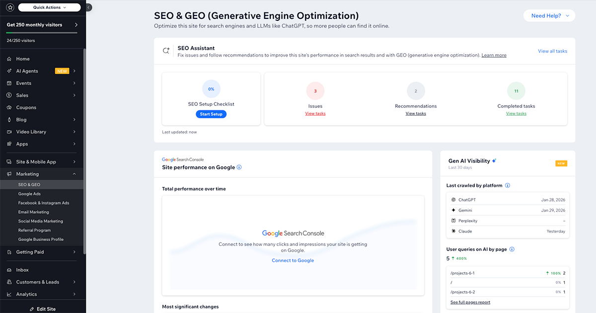 Where Wix really stands out is its SEO toolset. Every site includes the Wix SEO Setup Checklist (formerly SEO Wiz), which creates a personalized, step-by-step plan tailored to your business, location, and keyword research, powered by Semrush.
