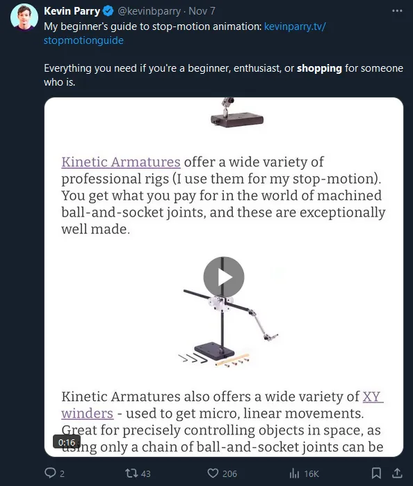 Stop-motion animator Kevin Parry sells his animation courses on Twitter (X), and also showcases links to essential gear you can buy.