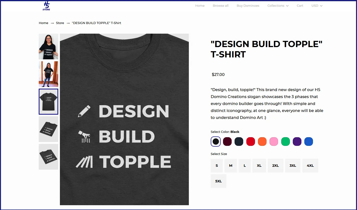 YouTube Domino Creator Hevesh5 encapsulates her brand perfectly with this “Design Build Topple” dominos tagline T-shirt in her Fourthwall shop!