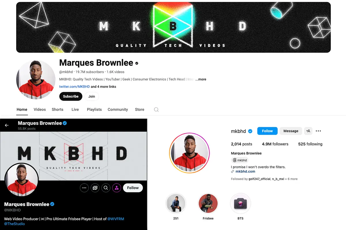 A creator who uses visual elements to stand out is Marques Brownlee (MKBHD), a tech guru and YouTube influencer. Marques' brand identity revolves around sleek, modern visuals with a bold red, black, and white color palette that mirrors the cutting-edge technology that he reviews.