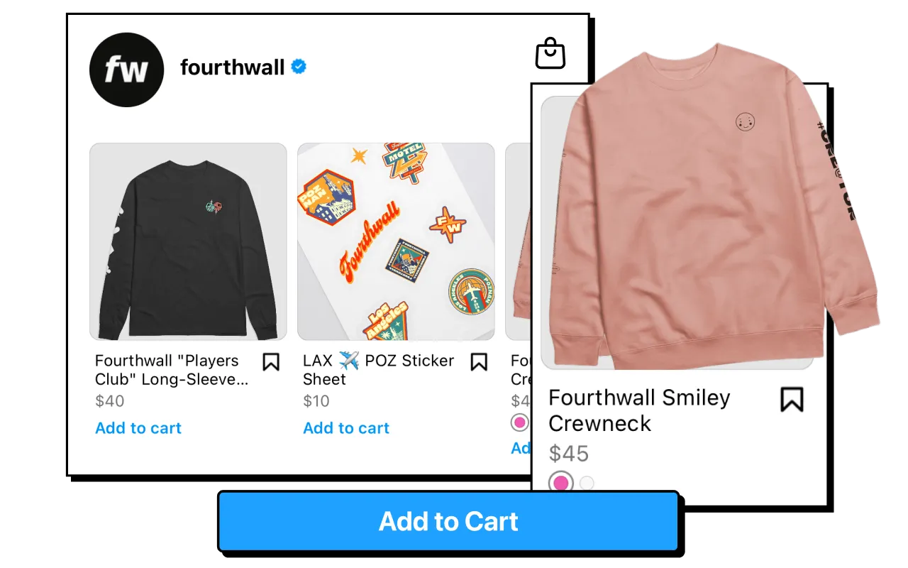 To add products to your Instagram catalog, you'll first need to connect your account to Facebook Commerce Manager. Then, you can either upload product information manually or use an e-commerce platform like Fourthwall to automatically sync your products. Once your catalog is set up, you can tag products directly in your Instagram posts and stories to make them shoppable for your supporters.