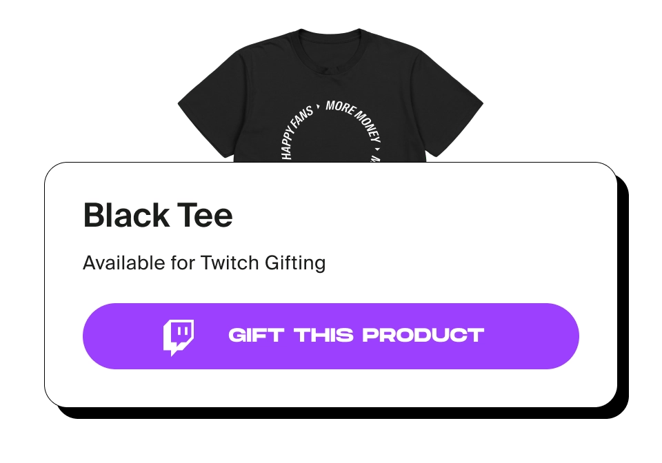 Fourthwall is the only platform that offers Twitch Merch Gifting. Our exclusive integration with Twitch allows a seamless experience for creators and their supporters.