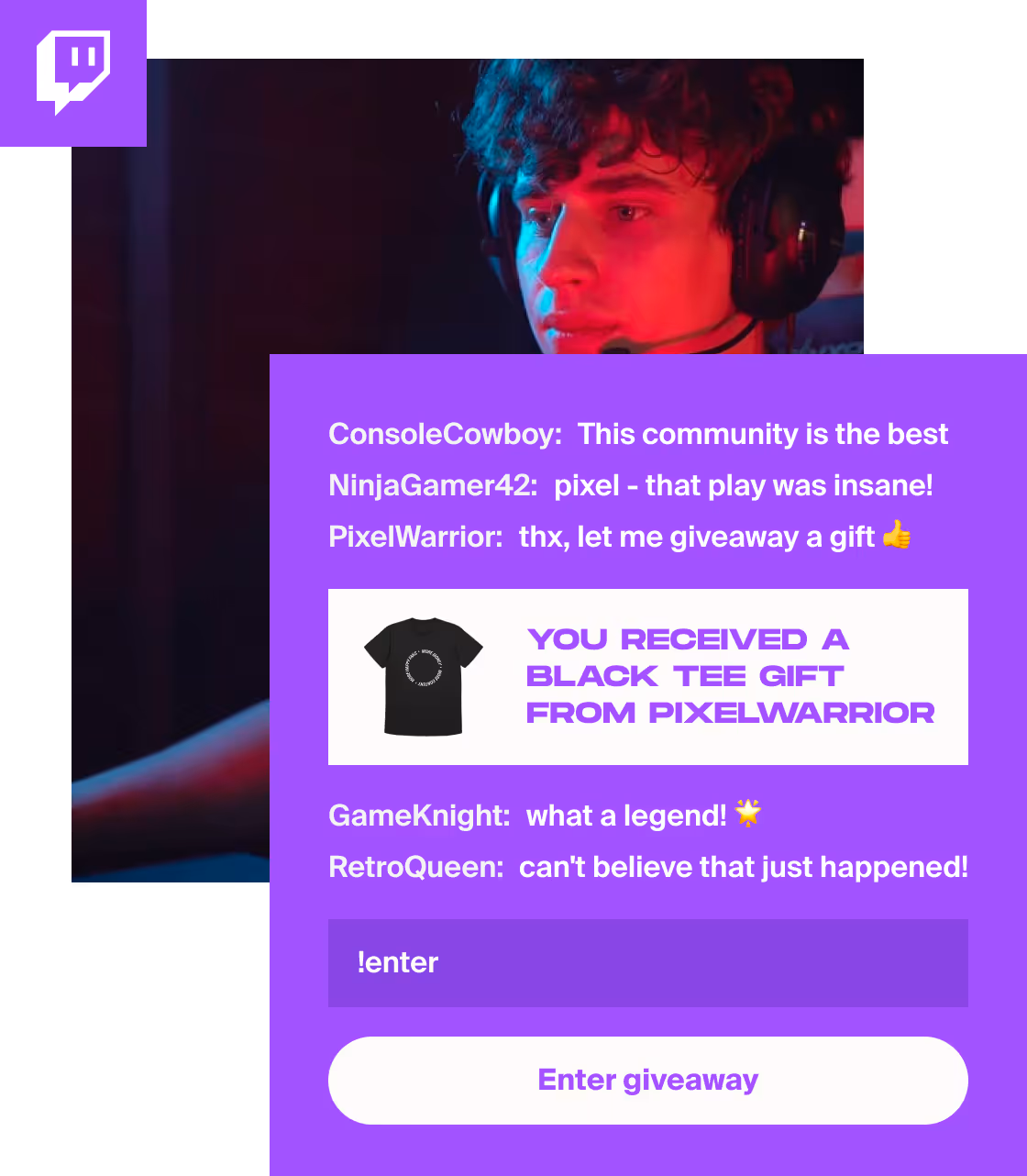 Anyone in your chat can choose to navigate to your Fourthwall site and gift merch or gift membership subscriptions. Anyone actively in your chat at the time of the gifting can enter by typing !enter within the allotted entry time.