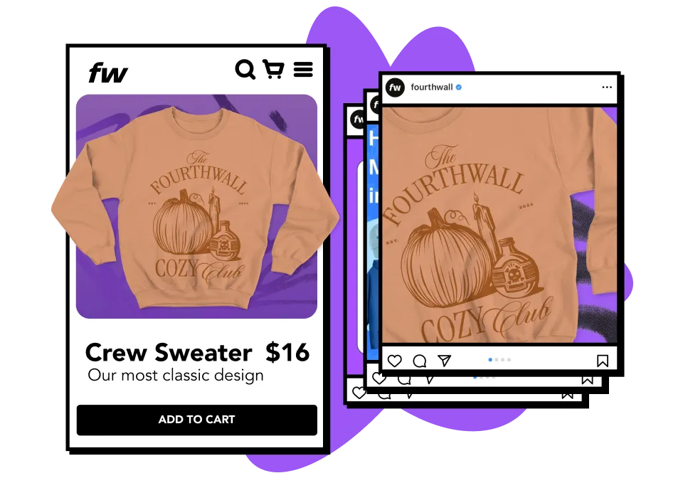 There are no monthly fees, no upfront costs, and no contracts to use Fourthwall. You set your prices and choose your own margins. Here is how our pricing and splits work when you sell: