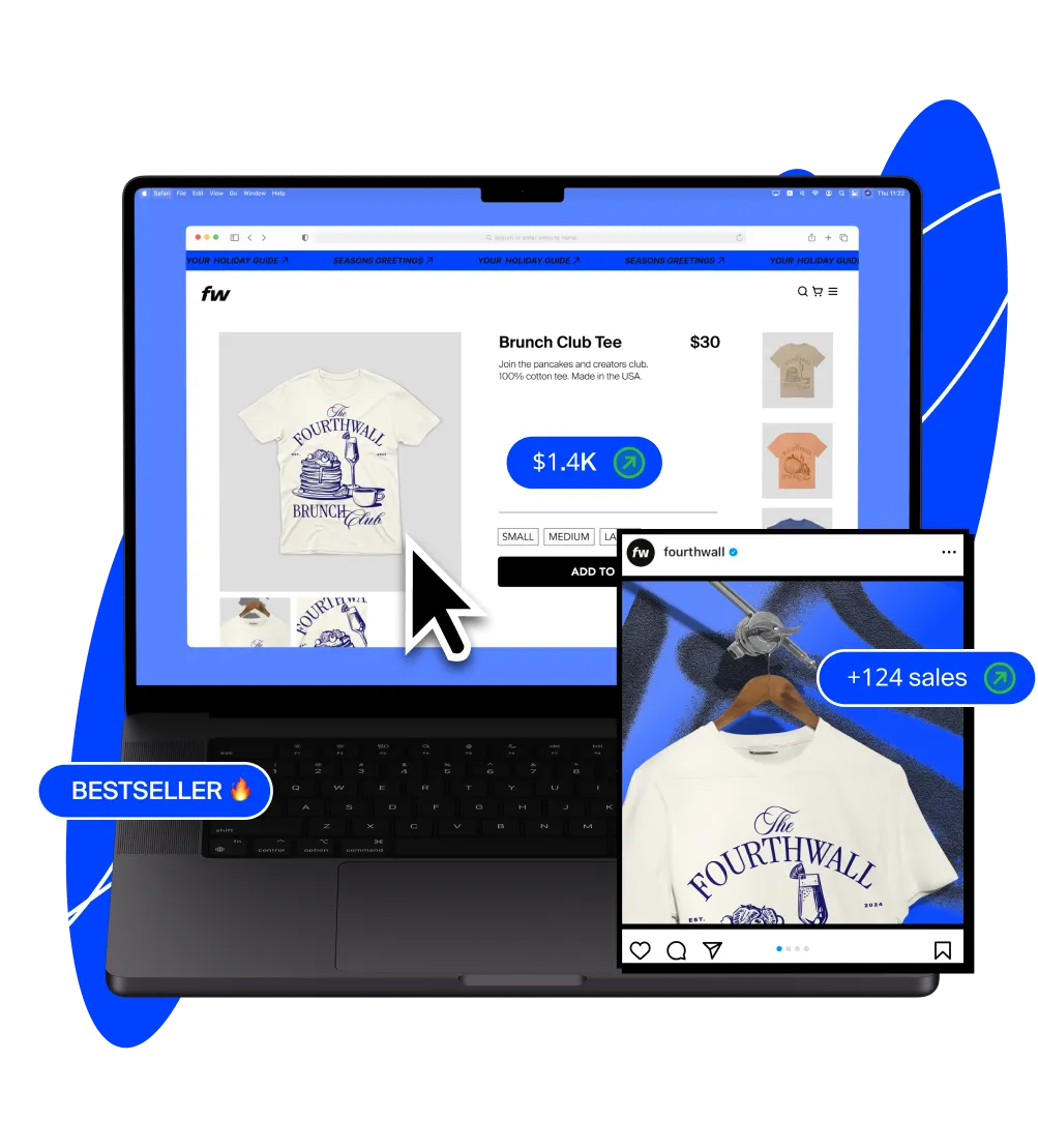 There are no monthly fees, no upfront costs, and no contracts to use Fourthwall. You set your prices and choose your own margins. Here is how our pricing and splits work when you sell: