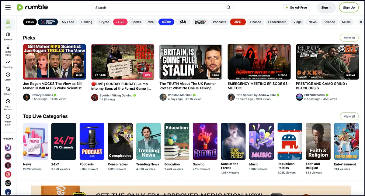 Known for its straightforward algorithm and minimal content restrictions, Rumble attracts independent creators seeking a platform free from shadow banning or stringent moderation.