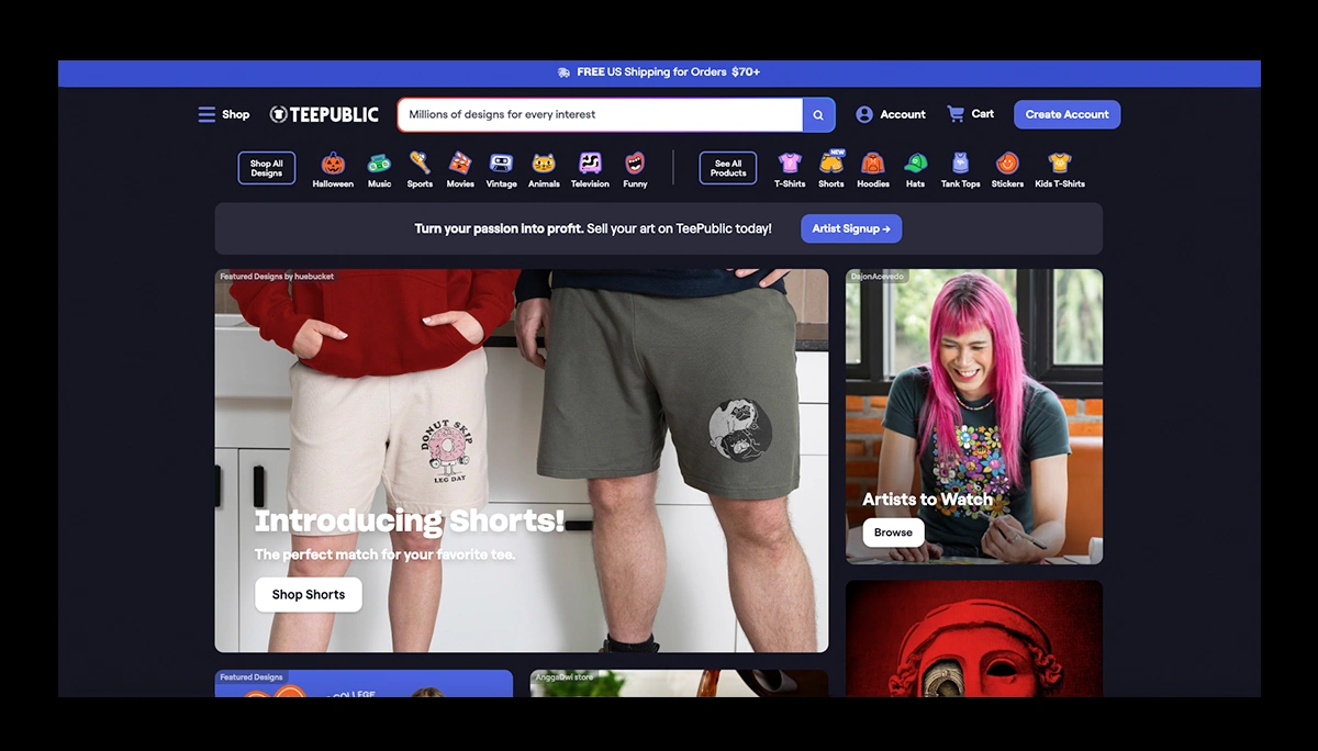 If you want to get your art in front of millions without dealing with the messy backend of fulfillment, TeePublic makes it simple.