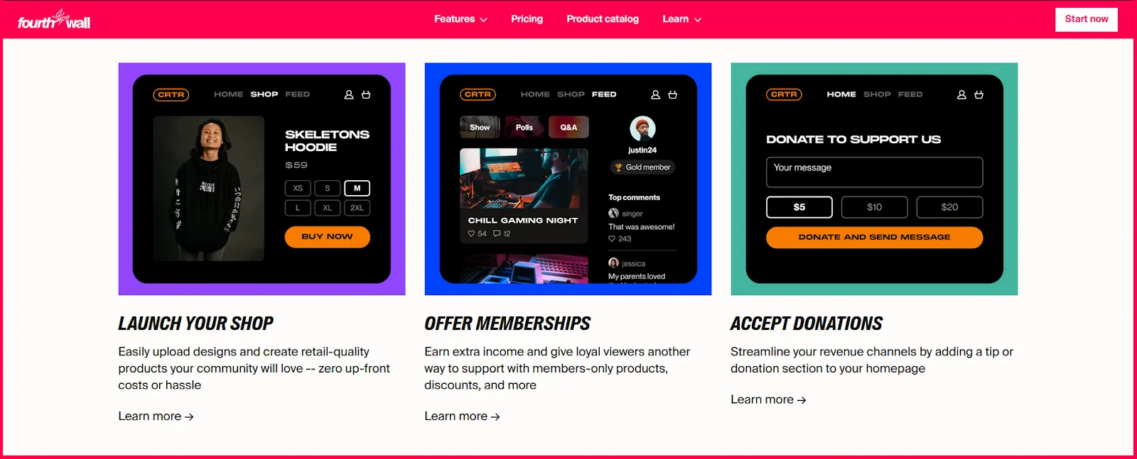 Fourthwall’s all-in-one platform facilitates the launch of websites, the selling of products, and the creation of memberships. It transforms digital endeavors into a cohesive and streamlined experience, empowering content creators and influencers to monetize your passion, create content, promote your products and socials, and connect with your fans, building long-term audience relationships that will help transform your content creation into a profitable ongoing career. Get started today!