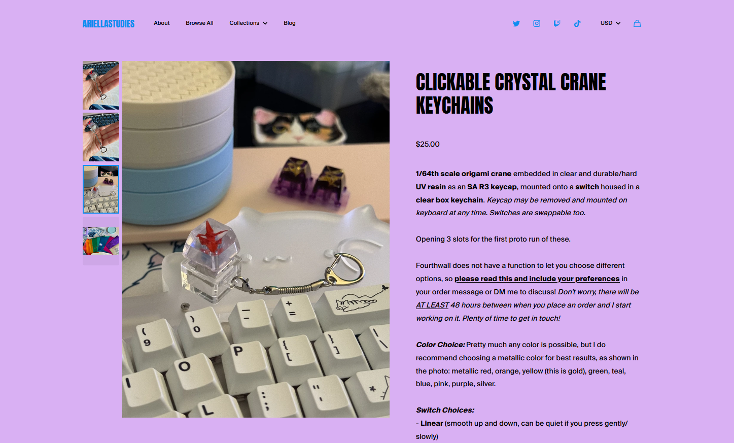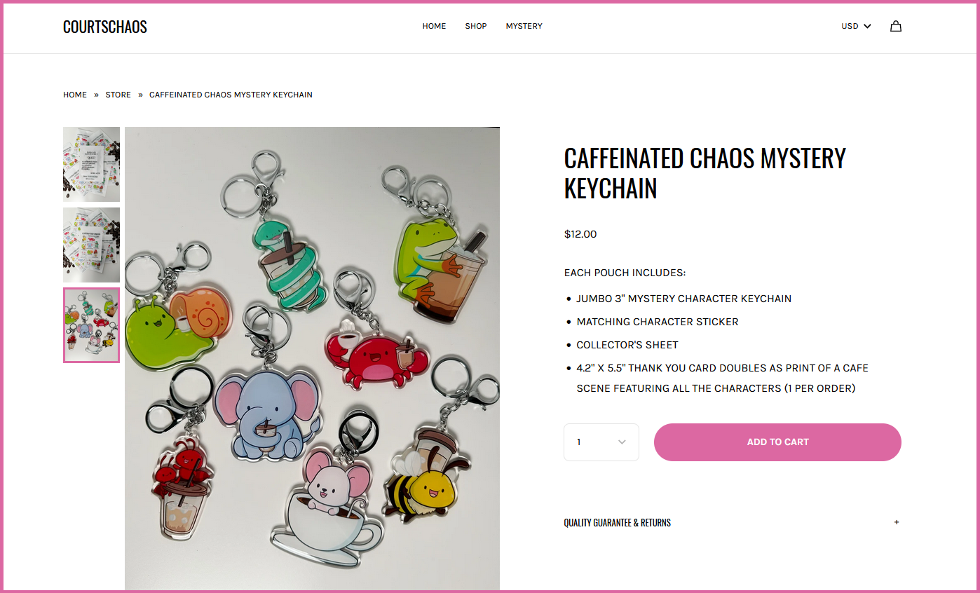 With easily customizable ecommerce stores and the ability to sell both your own keychains and customize Fourthwall's own print-on-demand acrylic keychains (and plenty of other items!), you can sell dozens of keychains with your designs, and let Fourthwall handle your merch orders and shipping under your brand name, so all you have to do is create more unique keychains for your customers to buy.