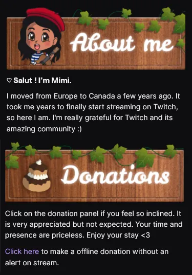 This method typically involves the streamer setting up a linked donation button on their Twitch channel's “About” page, plus a command that activates in chat to direct viewers to the donation/tip link. Viewers donating on Twitch can also add a message to the streamer with their donation; some streamers may have text-to-speech switched on, so the viewer can even hear their donation message live on stream.
