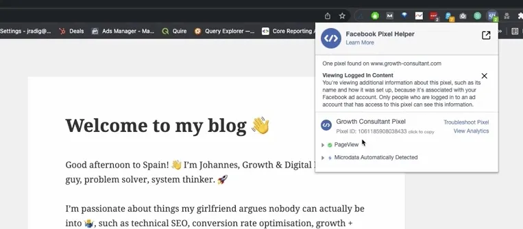Once installed, navigate to the URL where the Pixel is implemented, click on the extension icon in the browser's top-right corner, and verify that the Pixel ID matches the one you created.