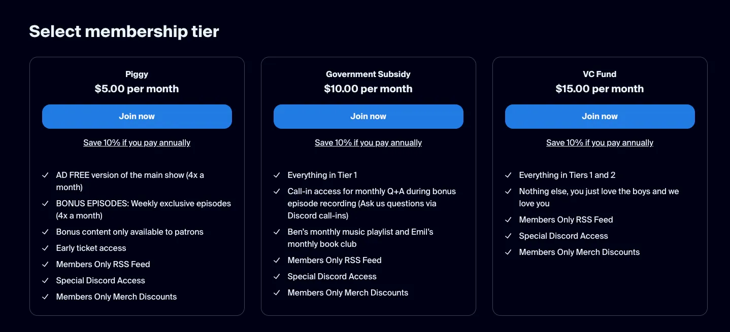 In the creator world, we use the term ‘memberships’ to describe this. As a creator, you can offer exclusive content or other perks to your supporters who become members of your site. Two popular membership platforms are Patreon and Fourthwall.