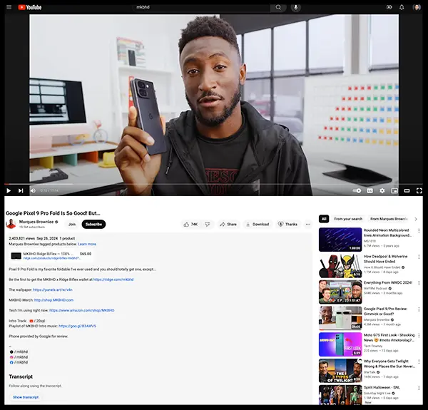 The popular tech guru always posts links to the products he reviews in his YouTube video's description box along with links to his personal merch store and Amazon shop. This helps Brownlee monetize his content by driving traffic to his affiliate links and personal brand, while also providing value to his audience.